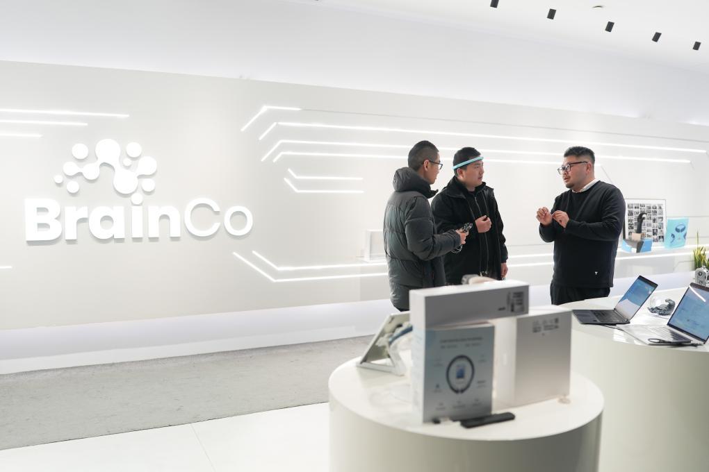 浙江強(qiáng)腦科技有限公司創(chuàng)始人韓璧丞(右一)與團(tuán)隊(duì)技術(shù)人員討論產(chǎn)品設(shè)計(jì)(2月26日攝)。新華社記者 黃宗治 攝