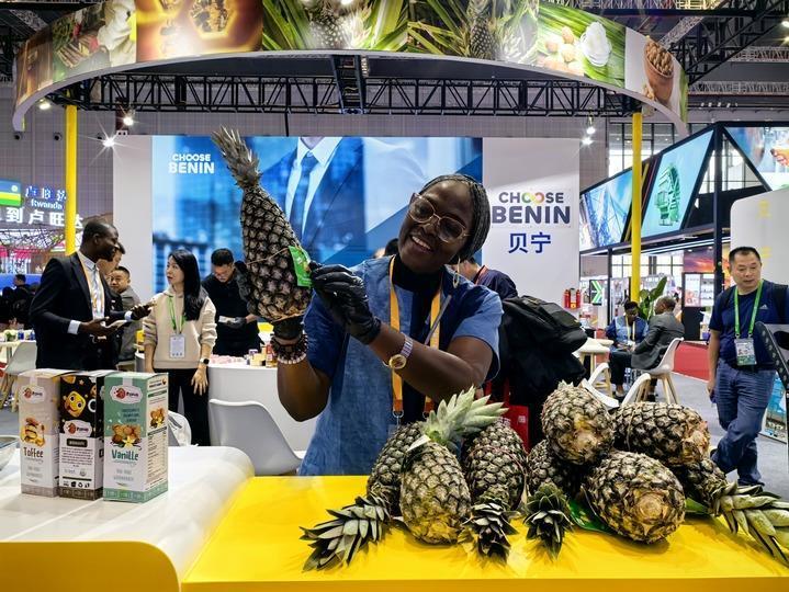 2024年11月7日,在上海舉行的第七屆中國國際進口博覽會上,貝寧國家館工作人員展示本國特色農(nóng)產(chǎn)品——貝寧菠蘿。新華社記者 郝王樂 攝