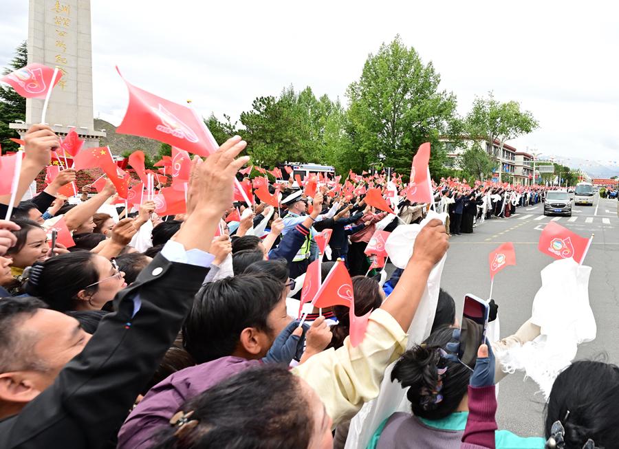 人群如潮水涌到道路兩旁,揮舞紅旗、手捧哈達(dá),高呼“扎西德勒”,聲聲祝福是“感恩總書(shū)記、感恩黨中央”的由衷表達(dá)。習(xí)近平總書(shū)記拉開(kāi)車(chē)窗,微笑著向人群揮手致意。
