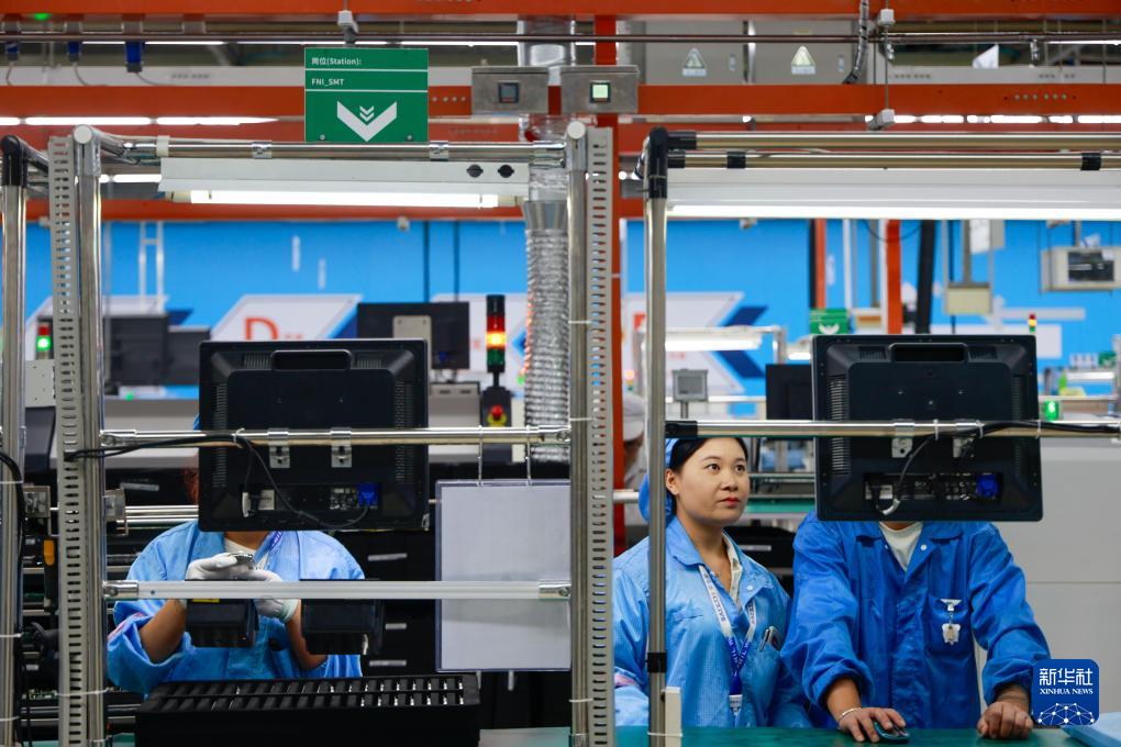 9月15日,工作人員在江蘇無(wú)錫高新區(qū)綜合保稅區(qū)捷普電子(無(wú)錫)有限公司的生產(chǎn)車間里作業(yè)。