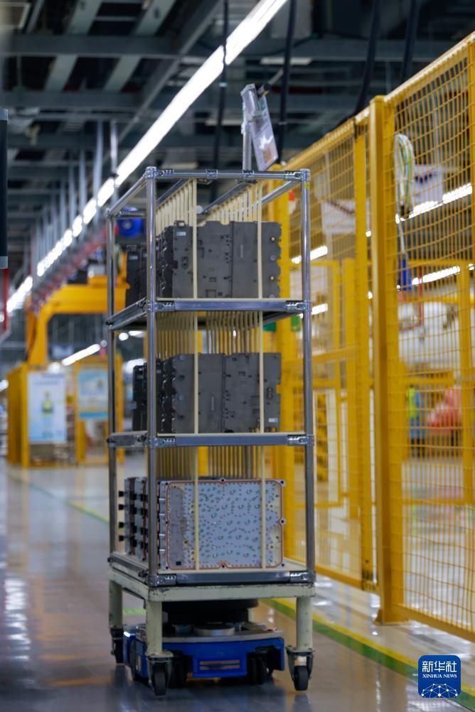 9月15日,一輛AGV自動(dòng)駕駛小車在江蘇無(wú)錫高新區(qū)綜合保稅區(qū)捷普電子(無(wú)錫)有限公司的生產(chǎn)車間里運(yùn)輸原材料。