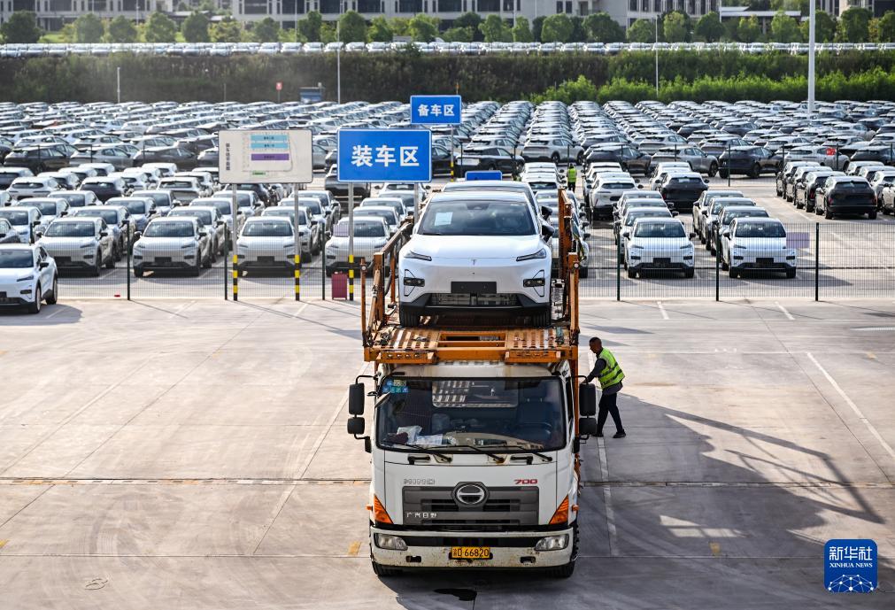 9月18日在位于重慶市渝北區(qū)的長安汽車數(shù)智工廠整車分撥中心拍攝的新能源汽車裝車現(xiàn)場(chǎng)。