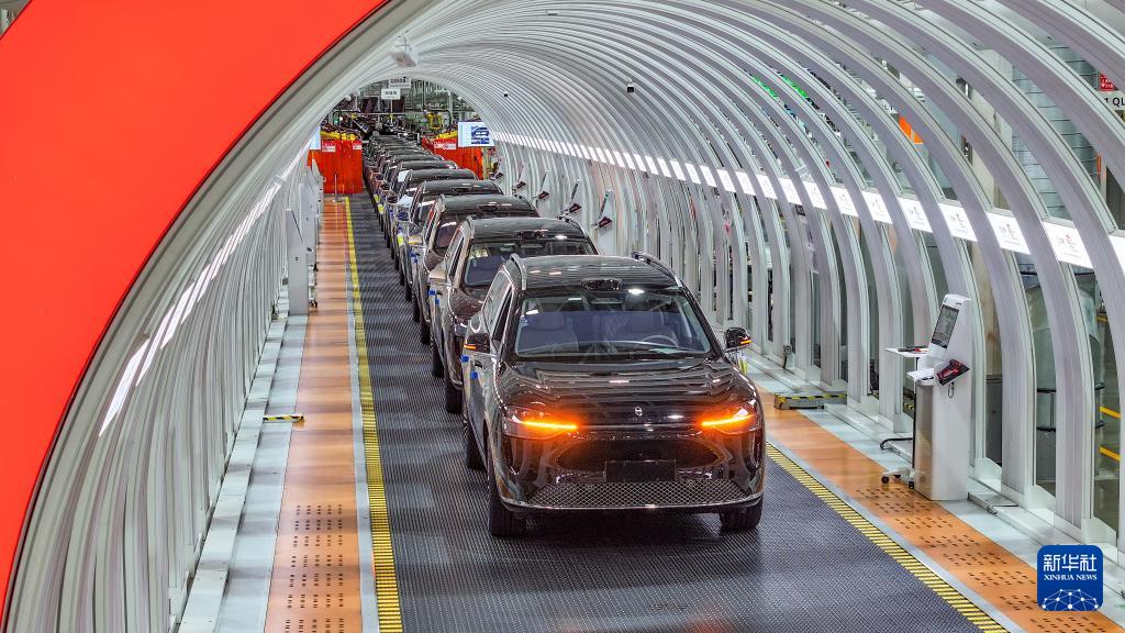 9月18日在位于重慶市渝北區(qū)的長安汽車數(shù)智工廠總裝車間拍攝的即將下線的新能源汽車。