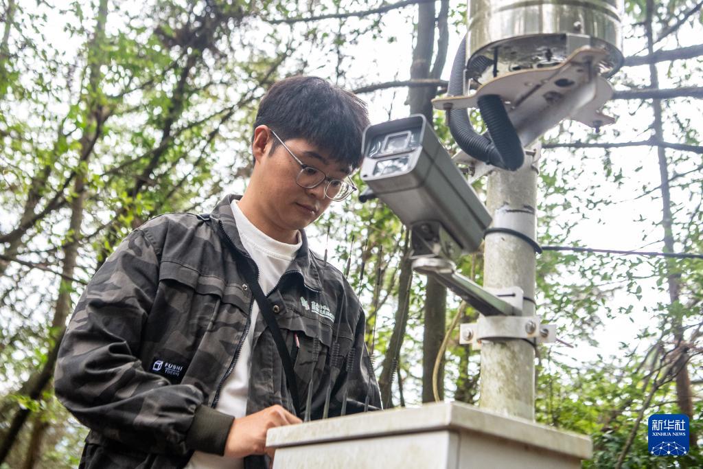9月23日,在金佛山黑葉猴遠程視頻監(jiān)控點,工作人員李新在檢查觀測設(shè)備。