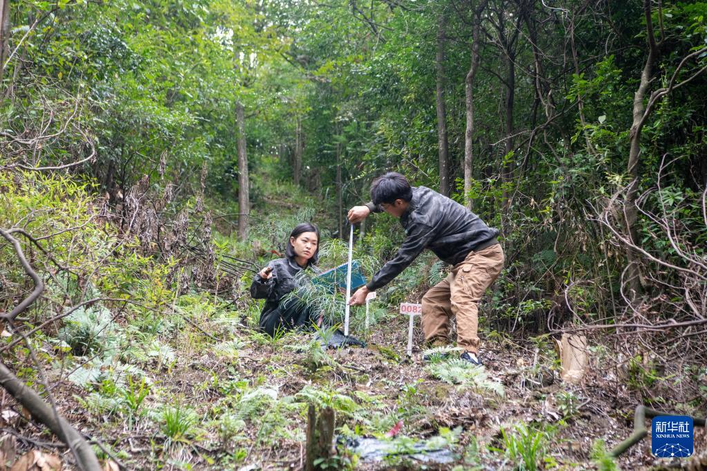 9月22日,在銀杉幼苗野外回歸地,李新(右)、王泳鰻在測量記錄銀杉幼苗生長情況。