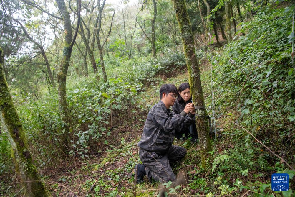 9月23日,工作人員李新(左)、王泳鰻在安裝紅外相機。