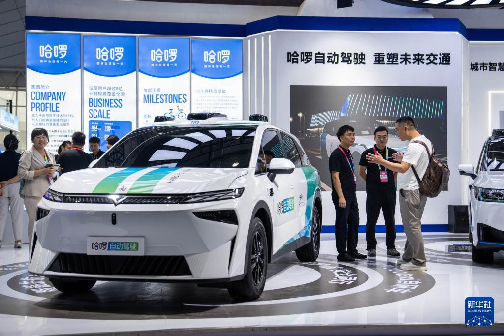9月24日,在株洲國際會展中心,觀眾(右一)在了解一臺配有北斗技術(shù)的自動駕駛汽車。