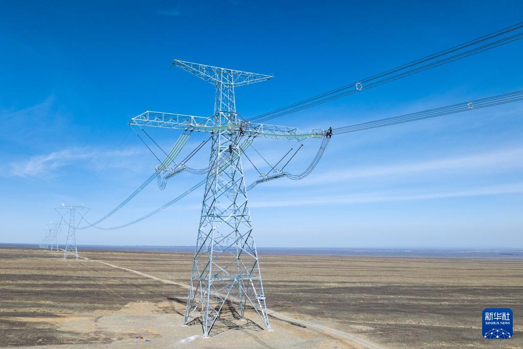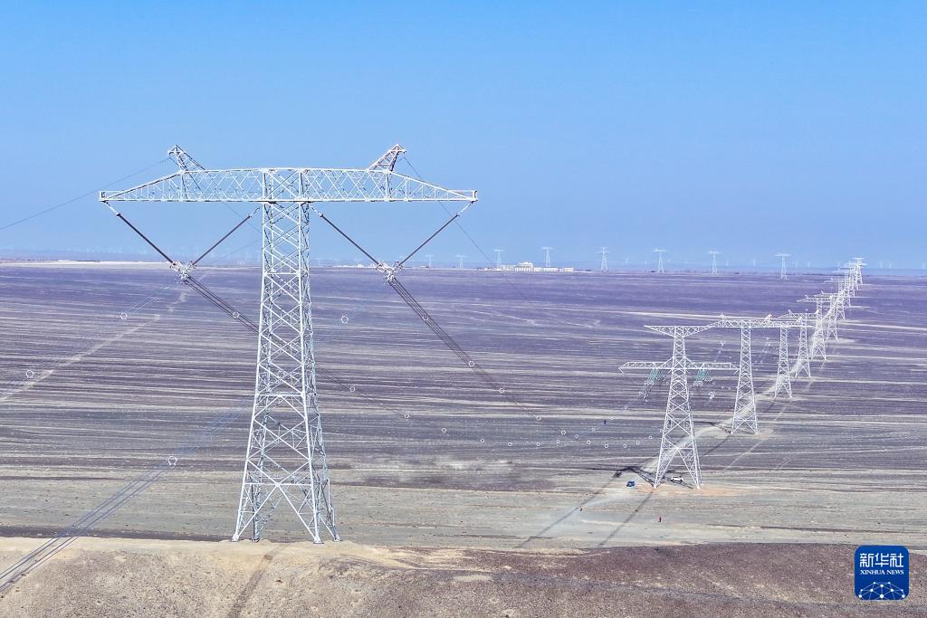 矗立在戈壁上的±800千伏哈密—重慶特高壓直流輸電線路工程(4月8日攝,無人機照片)。