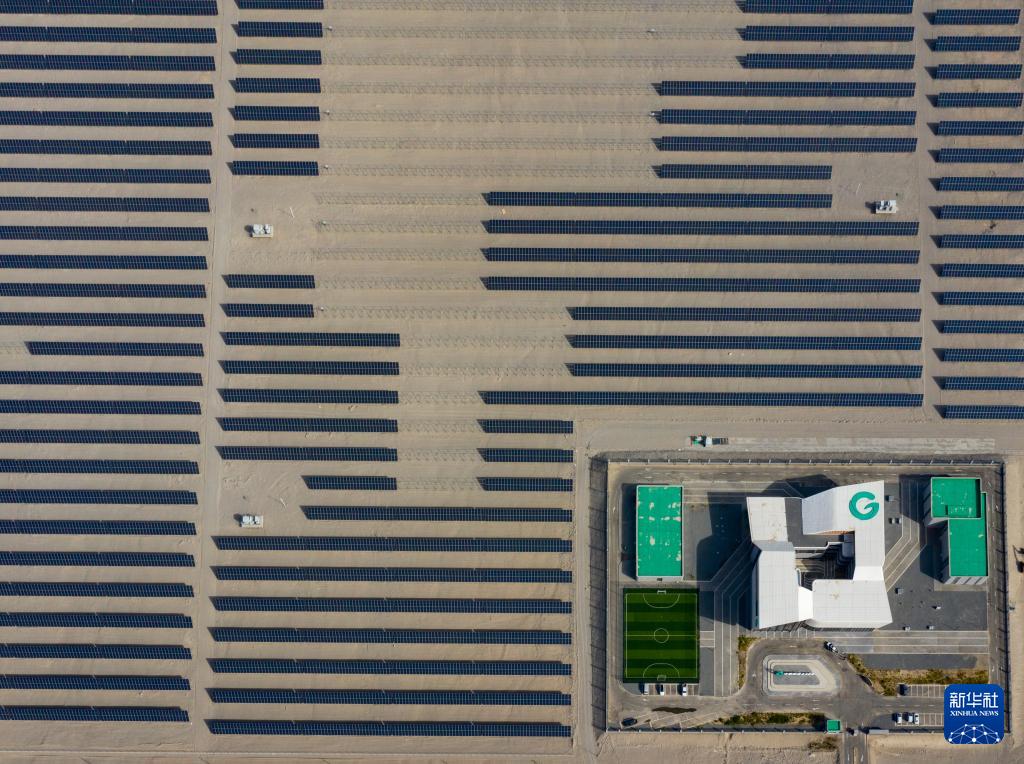9月22日在新疆巴音郭楞蒙古自治州若羌縣拍攝的中國綠發(fā)新疆中綠電若羌400萬千瓦光伏項目(無人機照片)。該項目每年可發(fā)電69.08億千瓦時,滿足南疆200萬戶家庭用電需求,減排208.24萬噸煤耗。