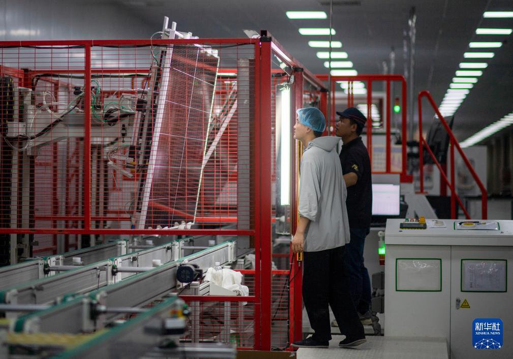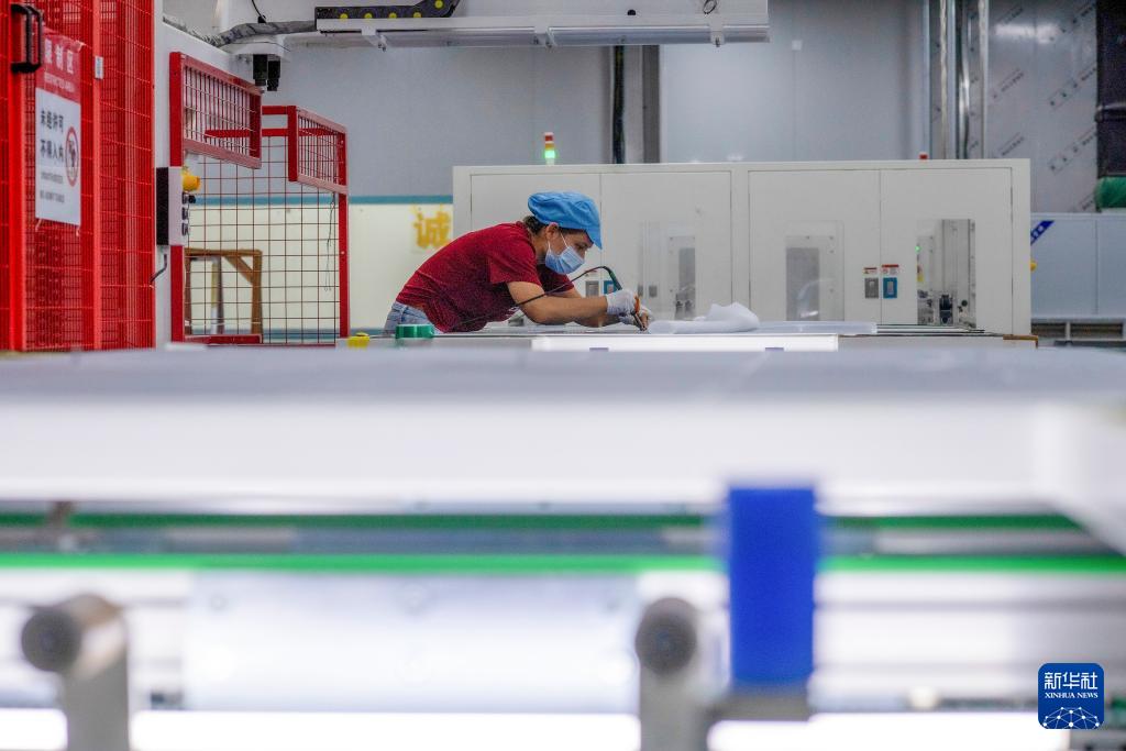 9月22日,工人在新疆巴音郭楞蒙古自治州若羌縣的國晟企誠新能源有限公司生產(chǎn)光伏電池片。
