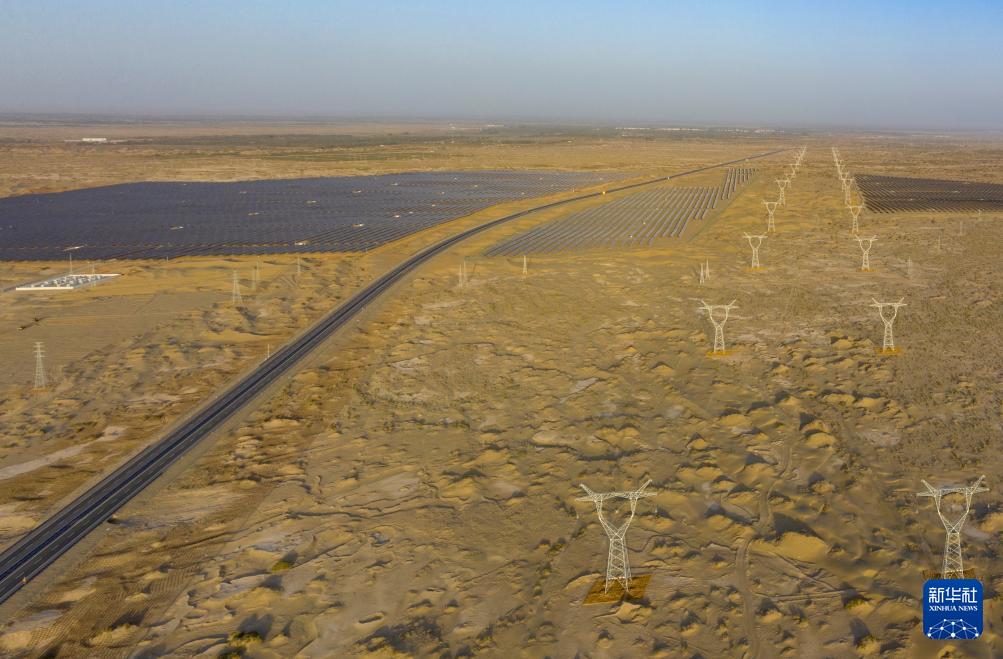 9月22日在新疆巴音郭楞蒙古自治州境內(nèi)的烏若高速附近拍攝的光伏電站和輸電線(無人機照片)。