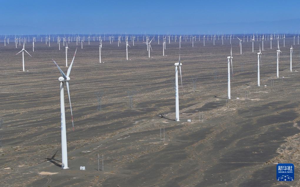 在新疆哈密地區(qū)巴里坤哈薩克自治縣拍攝的三塘湖風電場(4月27日攝,無人機照片)。
