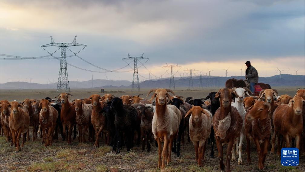 7月6日,在位于新疆昌吉回族自治州木壘哈薩克自治縣的±1100千伏昌吉-古泉特高壓直流輸電線路下,新疆送變電公司員工開展線路巡視,近處成群的羊在草地悠然覓食。