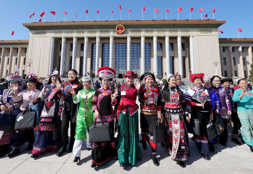 2024年3月8日,十四屆全國(guó)人大二次會(huì)議第二次全體會(huì)議結(jié)束后,女代表在北京人民大會(huì)堂前合影留念。新華社記者 王毓國(guó) 攝