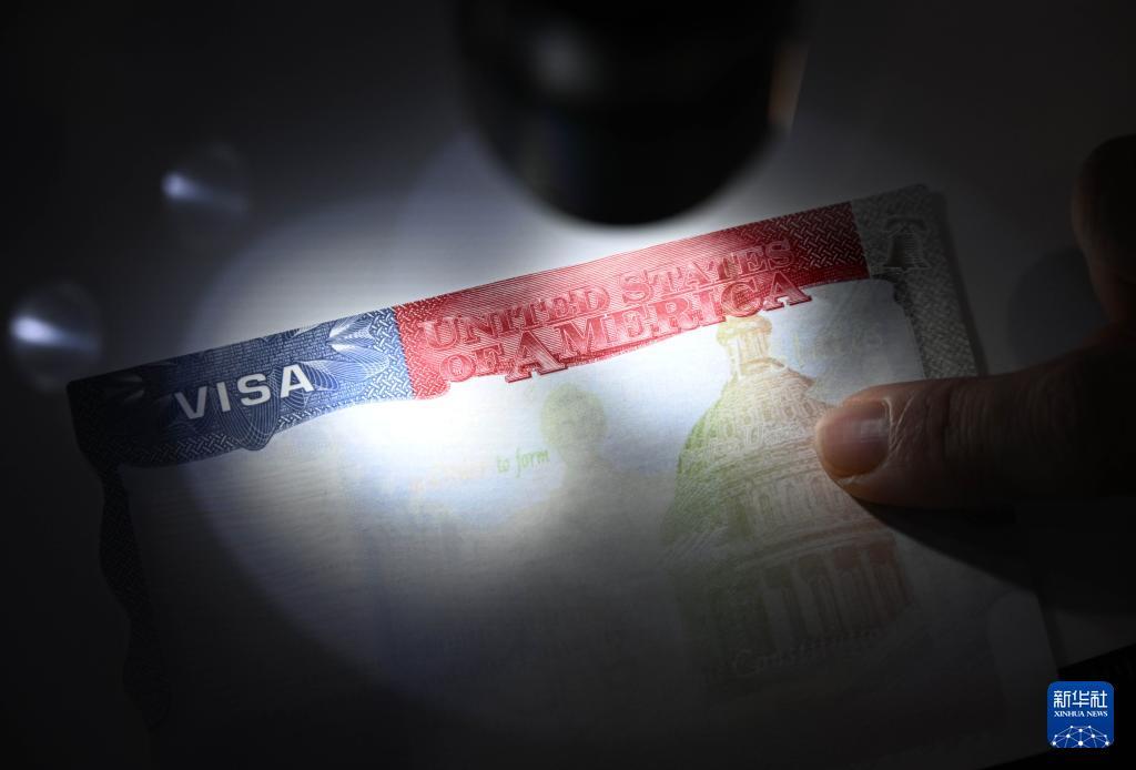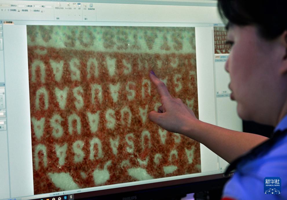 10月14日,青島機(jī)場邊檢站證研室內(nèi),移民管理警察通過光學(xué)儀器進(jìn)行簽證核查。