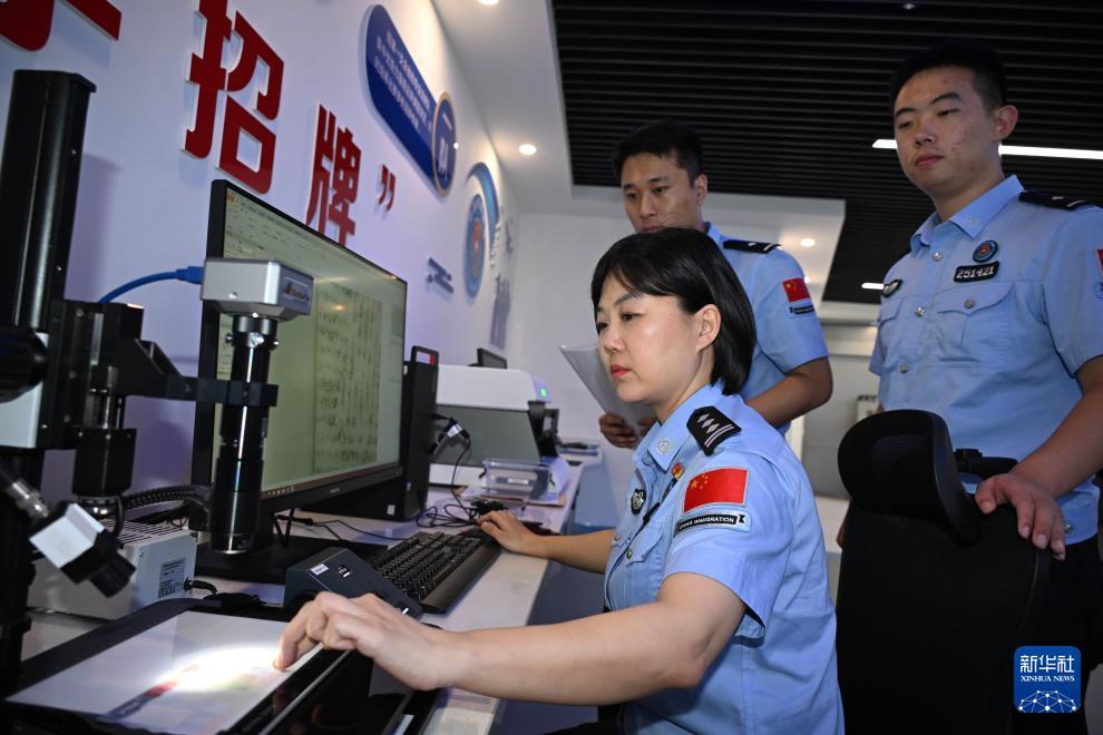 10月14日,青島機(jī)場邊檢站證研室內(nèi),移民管理警察在進(jìn)行簽證核查。