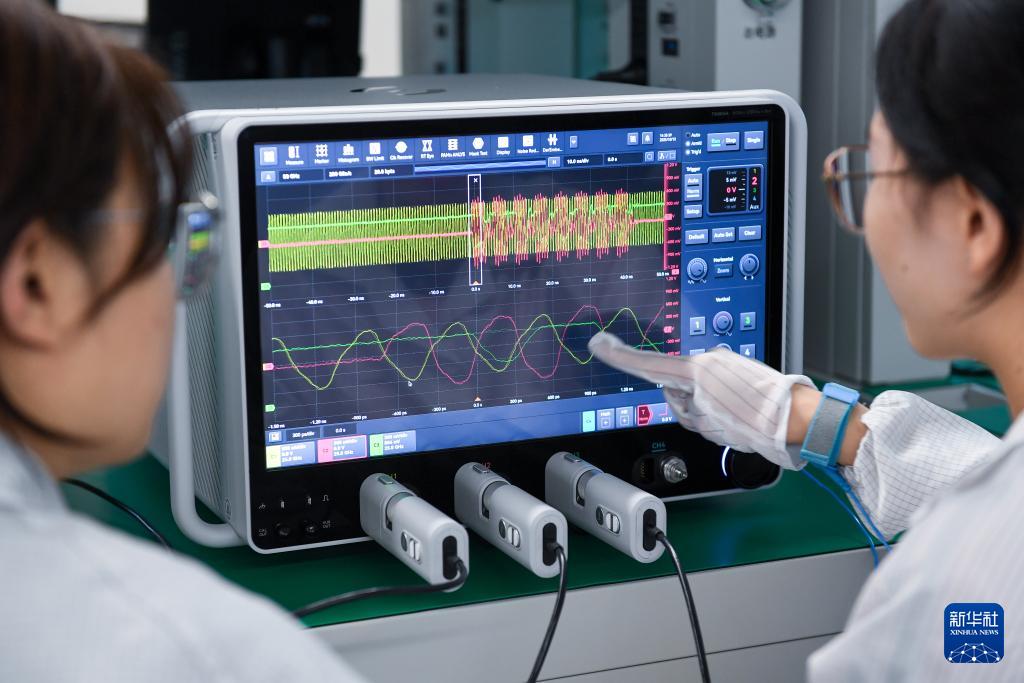 10月13日,在深圳市萬里眼技術(shù)有限公司,實(shí)驗(yàn)室人員分析高速信號(hào)時(shí)序關(guān)系。