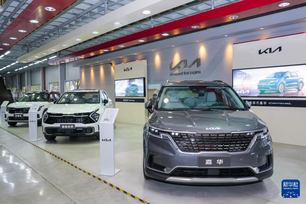 位于中韓(鹽城)產(chǎn)業(yè)園的江蘇悅達起亞汽車有限公司內(nèi)展示的汽車(10月16日攝)。