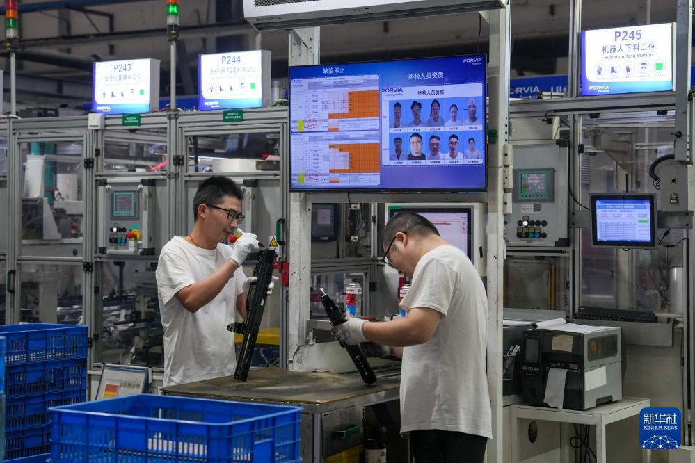 工人在佛吉亞(鹽城)汽車部件系統(tǒng)有限公司汽車配件生產(chǎn)車間內(nèi)工作(9月18日攝)。