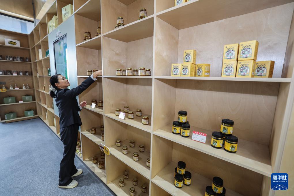 10月22日拍攝的位于金華市金東區(qū)赤松鎮(zhèn)北山口村的金華佛手農(nóng)林服務(wù)中心內(nèi)的商品展陳中心,展示和銷售包括佛手膏、佛手茶、佛手酒、佛手蜜餞等在內(nèi)的各類佛手衍生產(chǎn)品。