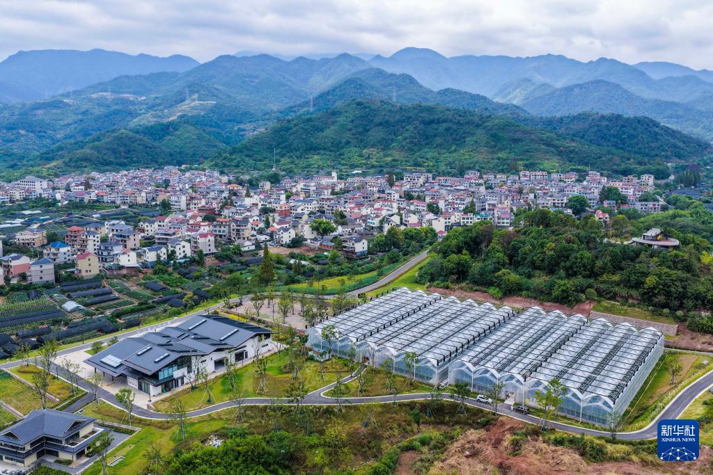 10月22日拍攝的金華市金東區(qū)赤松鎮(zhèn)北山口村的金華佛手農(nóng)林服務(wù)中心(左下),旁邊是配套的現(xiàn)代化佛手種植大棚(無人機照片)。