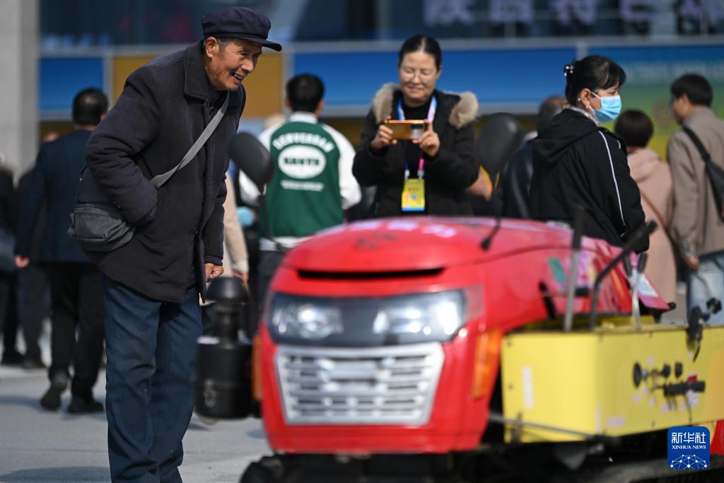 10月26日,參觀者在第32屆楊凌農(nóng)高會上了解魯力農(nóng)機(jī)的履帶自走式多功能微耕機(jī)。