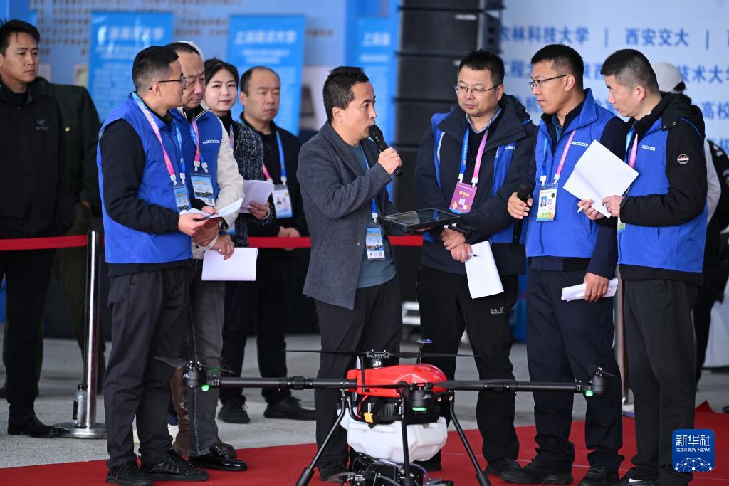 10月26日,在第32屆楊凌農(nóng)高會的農(nóng)業(yè)機(jī)器人比賽上,陜西華基楓林科技有限公司的技術(shù)人員(前中)向評委介紹參賽的農(nóng)用無人機(jī)產(chǎn)品。