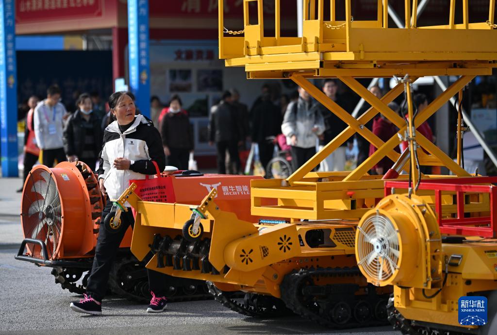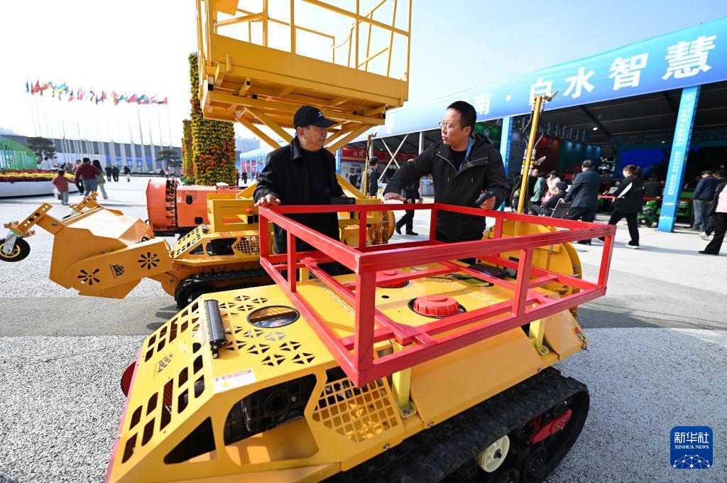 10月26日,參觀者在第32屆楊凌農(nóng)高會上了解渭南君創(chuàng)飛科技有限公司的履帶果園管理機(jī)。