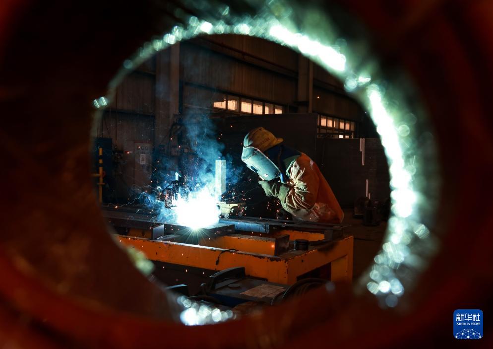 10月27日,中鐵科工集團軌道交通裝備有限公司技術工人對盾構(gòu)機盾體配件進行電焊作業(yè)。