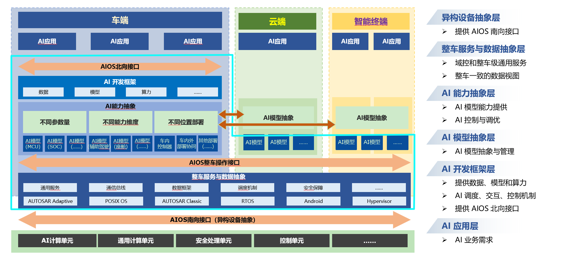 針對(duì)于AIOS整體框架,李冰針對(duì)異構(gòu)設(shè)備抽象層、整車服務(wù)與數(shù)據(jù)抽象層、AI能力抽象層、AI模型抽象層、AI開發(fā)框架層、AI應(yīng)用層的六層架構(gòu)做了簡(jiǎn)略介紹。