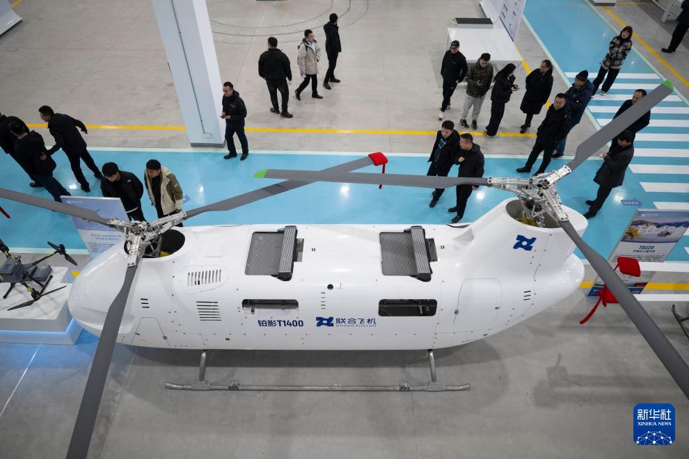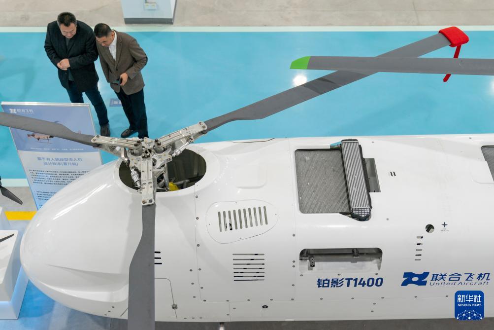 10月30日,在哈爾濱市平房區(qū)的哈爾濱聯(lián)合飛機科技有限公司生產(chǎn)廠區(qū),人們參觀T1400無人直升機。