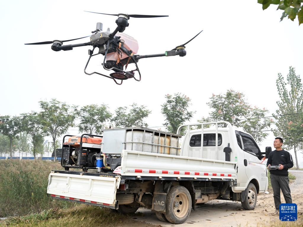 10月30日,在河南省清豐縣固城鎮(zhèn)張莊里村,農(nóng)戶(hù)在操作無(wú)人巡田機(jī)起飛。