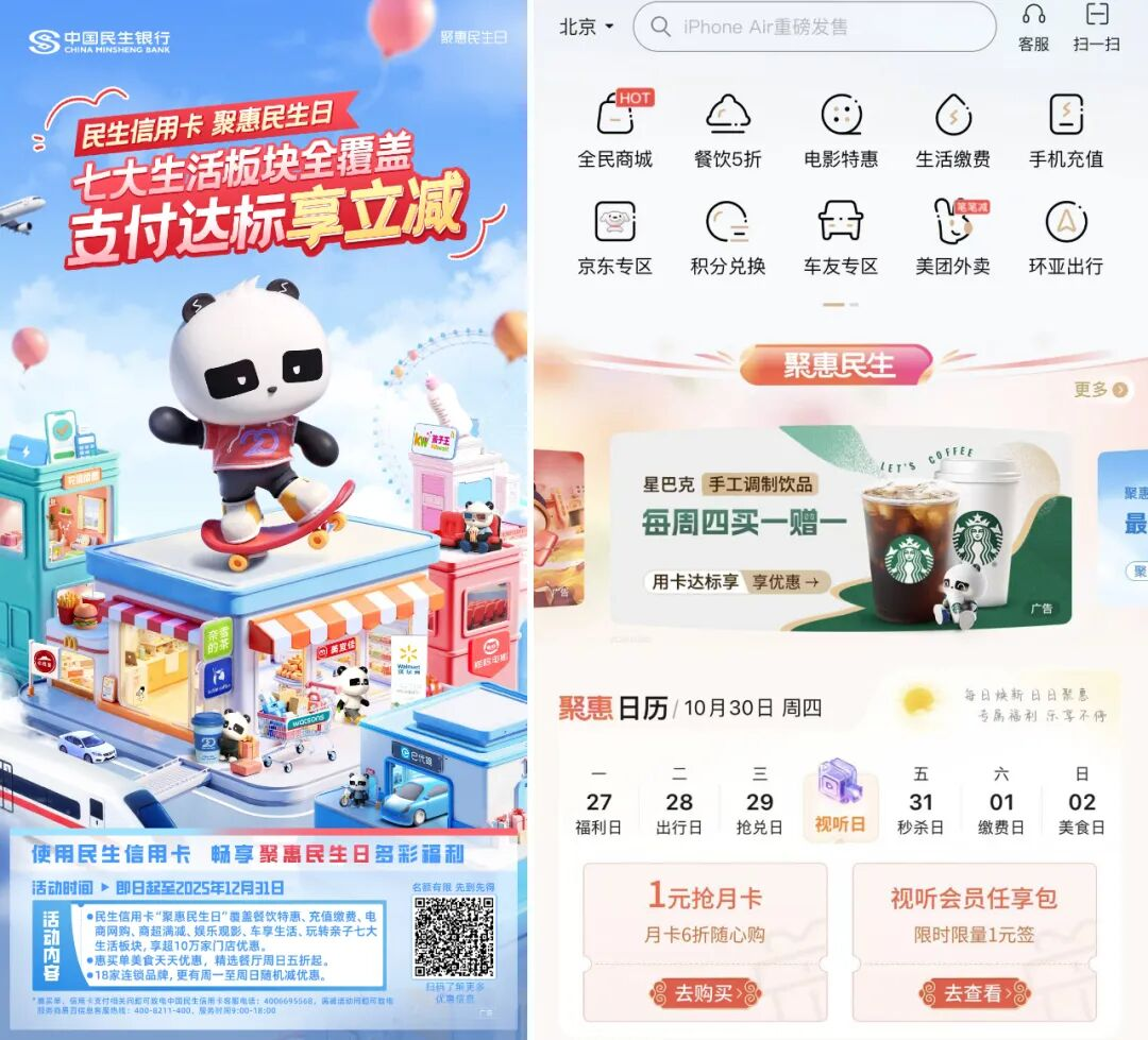 其中,中國民生銀行信用卡中心(以下簡稱“民生信用卡中心”)與京東、抖音、支付寶、攜程等頭部平臺聯(lián)動,推出“一鍵綁卡贈支付禮包”和“聚惠民生日”活動。