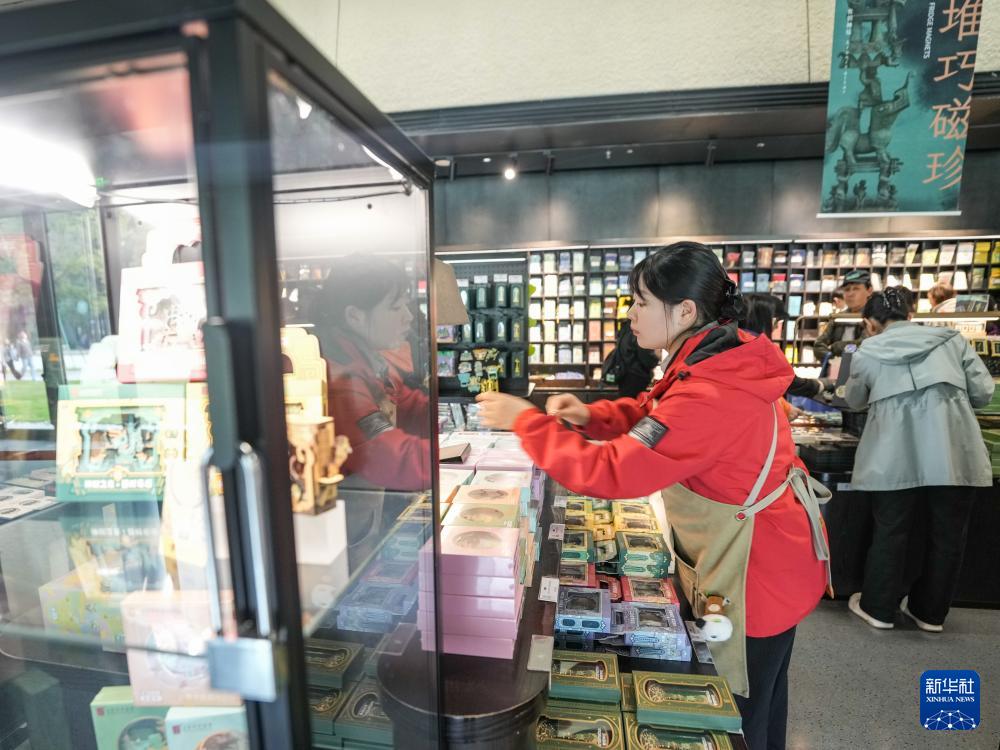 在四川省廣漢市三星堆博物館文創(chuàng)商店,工作人員往貨架上補(bǔ)充文創(chuàng)產(chǎn)品(10月30日攝)。