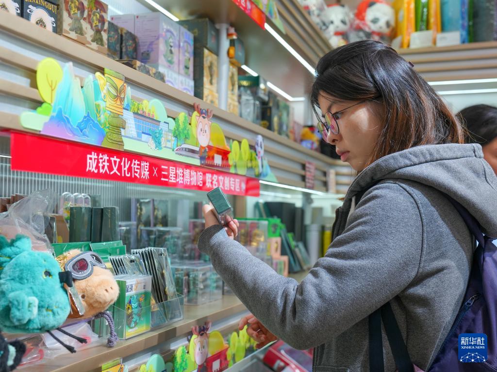 旅客在位于成都東站的三星堆博物館與鐵路部門聯(lián)名文創(chuàng)專區(qū)商店內(nèi)選購文創(chuàng)產(chǎn)品(11月3日攝)。