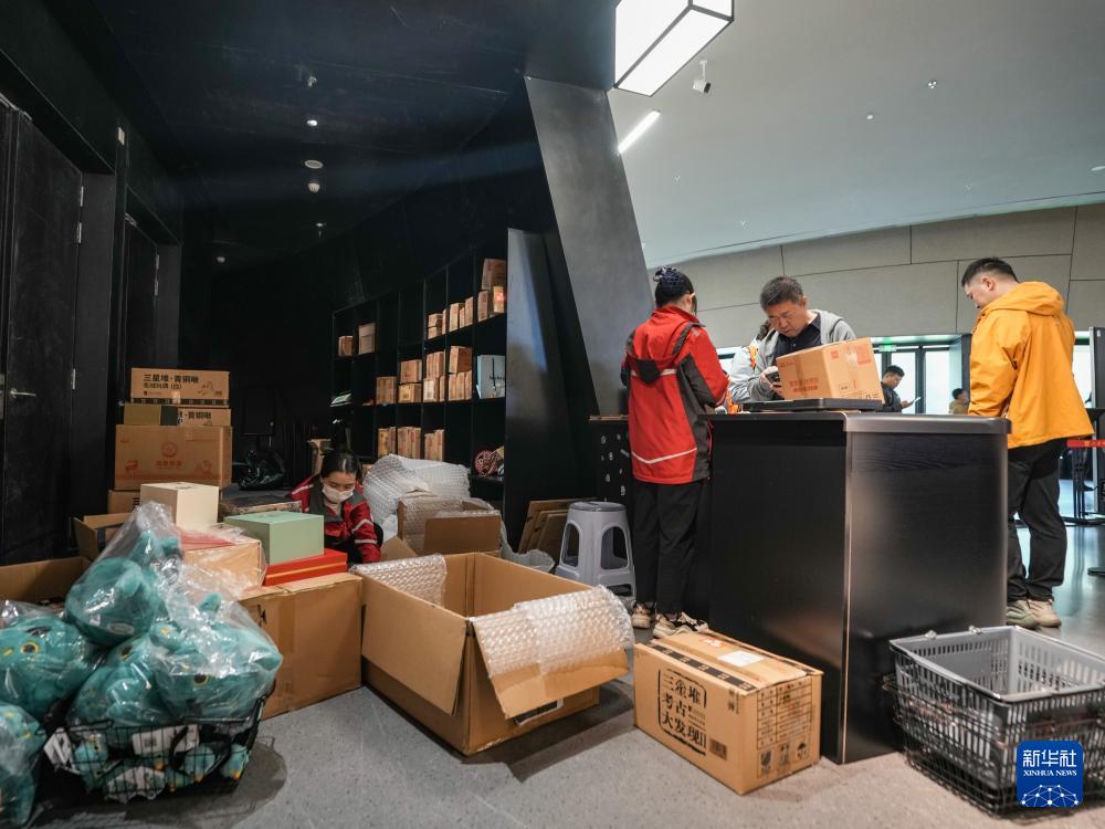 在四川省廣漢市三星堆博物館文創(chuàng)商店,現(xiàn)場快遞點(diǎn)工作人員將游客選購的文創(chuàng)產(chǎn)品打包發(fā)貨(10月30日攝)。