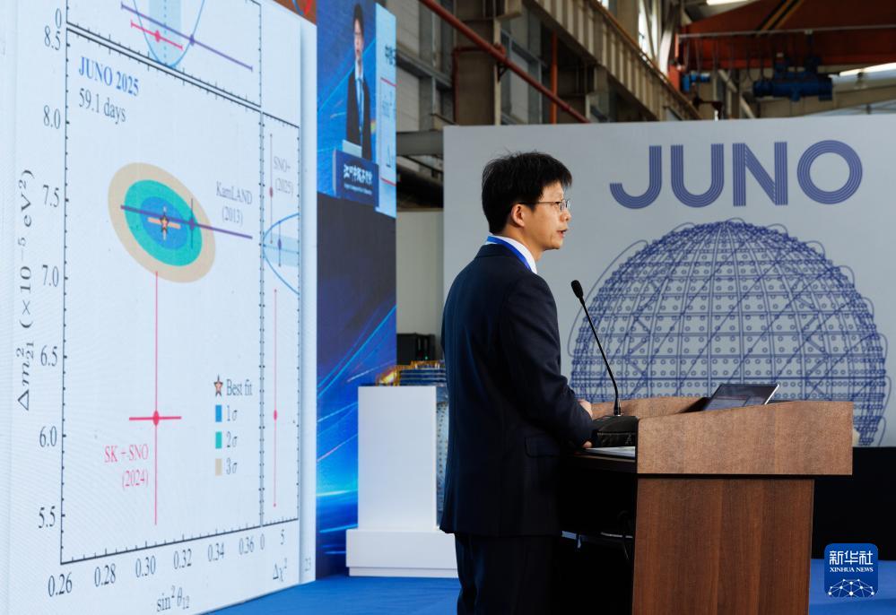 11月19日,在廣東省江門市舉行的發(fā)布會上,中國科學院高能物理研究所副所長、江門中微子實驗國際合作組物理分析負責人溫良劍在報告首個物理成果。