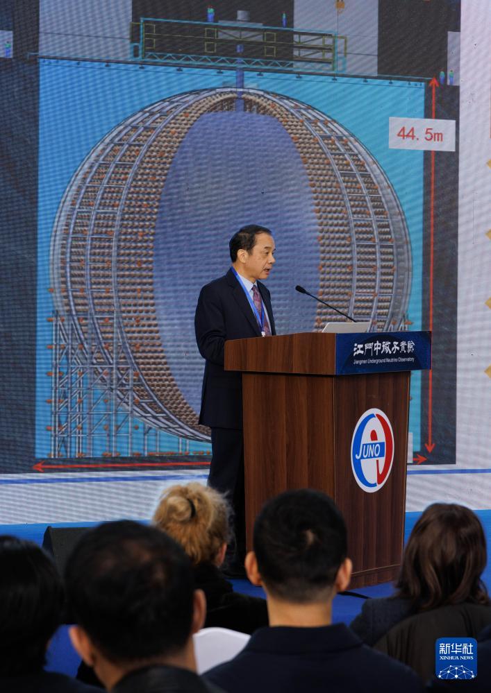 11月19日,在廣東省江門市舉行的發(fā)布會上,中國科學院院士、江門中微子實驗項目經(jīng)理王貽芳在介紹項目情況。