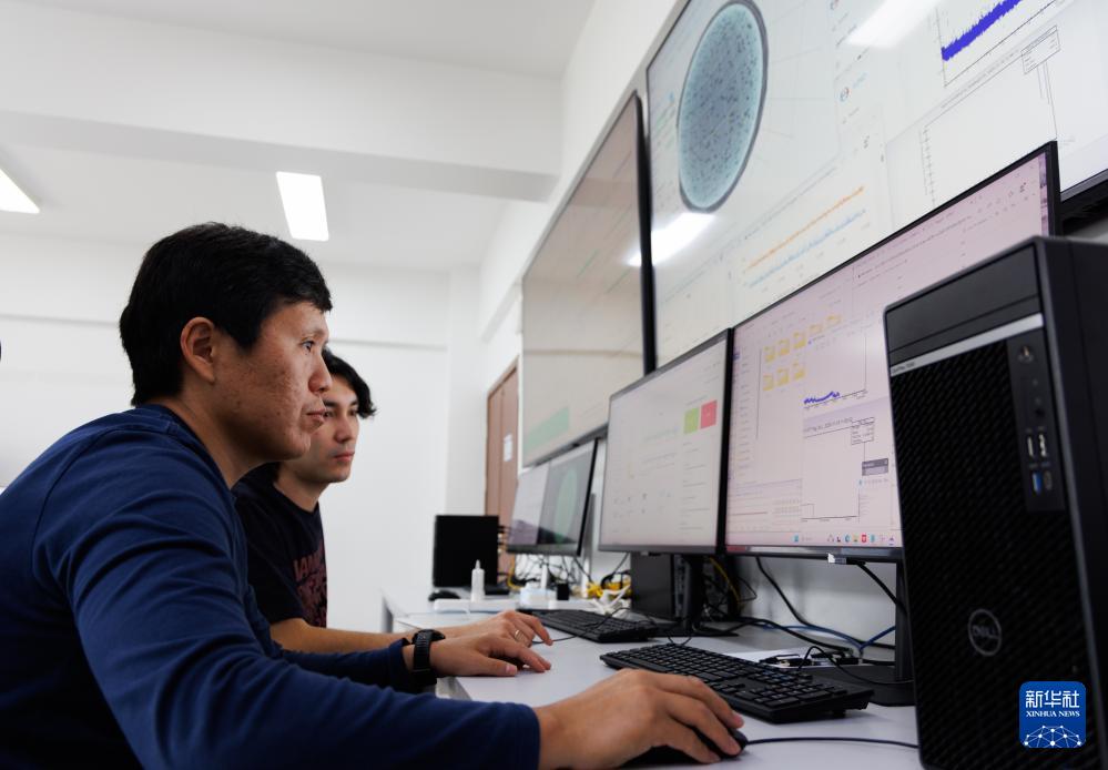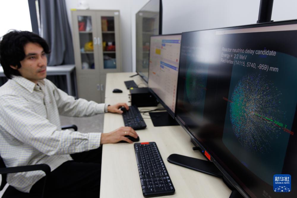 11月19日,科研人員在江門中微子實驗運行控制室監(jiān)測探測器運行情況。