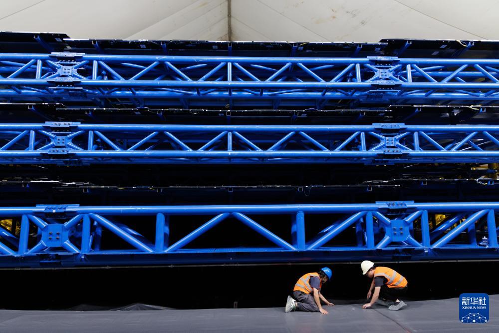 2024年10月9日拍攝的建設(shè)中的江門中微子實驗中心探測器(拼接照片)。