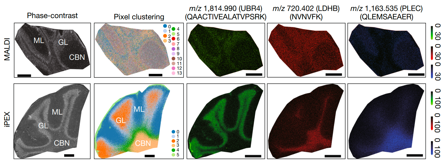 “蛋白質(zhì)的空間分布是理解細(xì)胞功能與疾病發(fā)生的關(guān)鍵,但現(xiàn)有空間蛋白質(zhì)組學(xué)技術(shù)長(zhǎng)期面臨‘看得少、看不清、空間位置難還原’的困境。iPEX技術(shù)創(chuàng)新性融合水凝膠蛋白質(zhì)錨定、組織膨脹與質(zhì)譜成像三大核心技術(shù),成功破解這一難題?!编u貽龍介紹,實(shí)驗(yàn)驗(yàn)證顯示,該技術(shù)檢測(cè)靈敏度相較傳統(tǒng)空間蛋白質(zhì)組學(xué)技術(shù)提升10—100倍,有效像素尺寸達(dá)1—5微米,單樣本可檢測(cè)600—1500種蛋白質(zhì),同時(shí)能捕捉蛋白空間共定位關(guān)系。