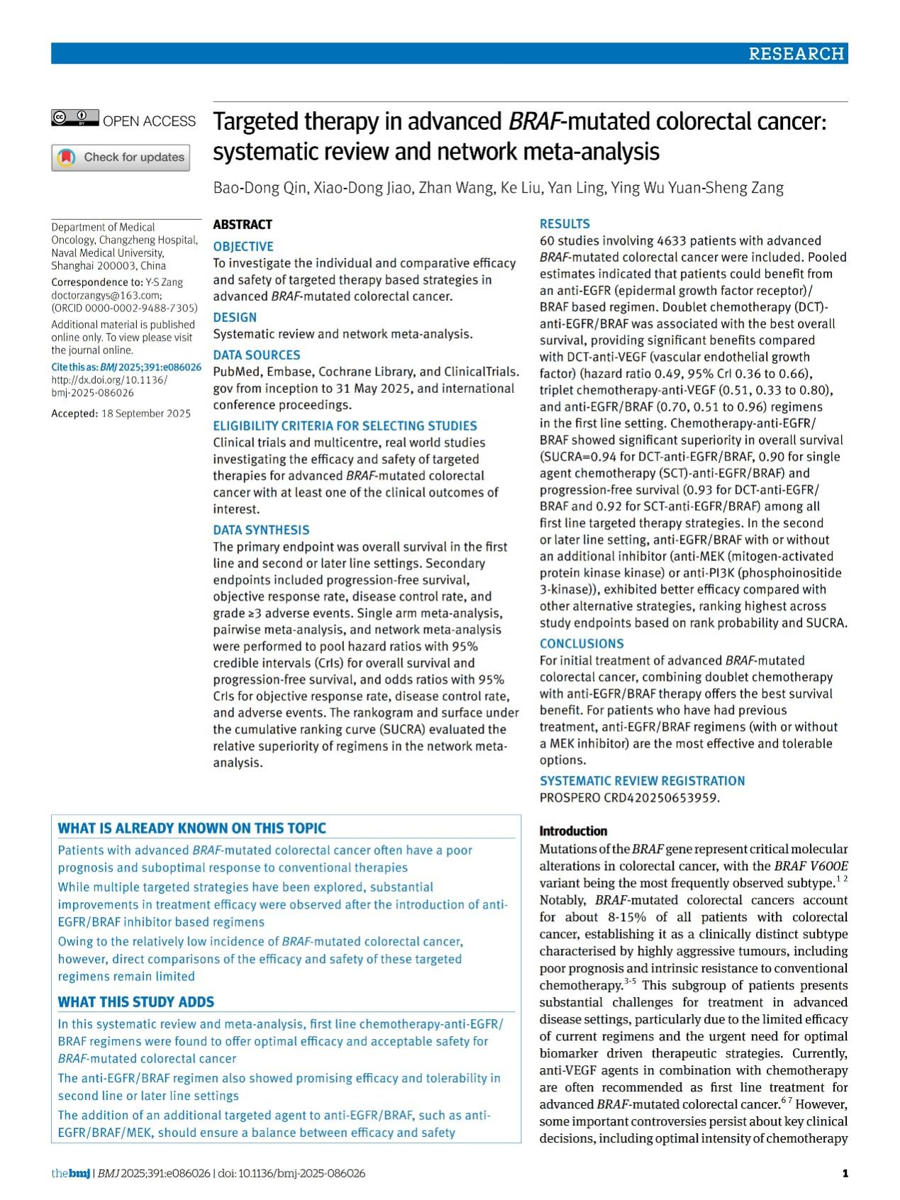 記者11月21日從海軍軍醫(yī)大學第二附屬醫(yī)院(上海長征醫(yī)院)獲悉,該院腫瘤科臧遠勝、秦保東教授團隊對治療BRAF突變型腸癌的方案進行了全面、深入研究,為該類患者的療效突破提供了原創(chuàng)“長征方案”的關(guān)鍵證據(jù)。相關(guān)論文在最新一期《英國醫(yī)學雜志》上發(fā)表。