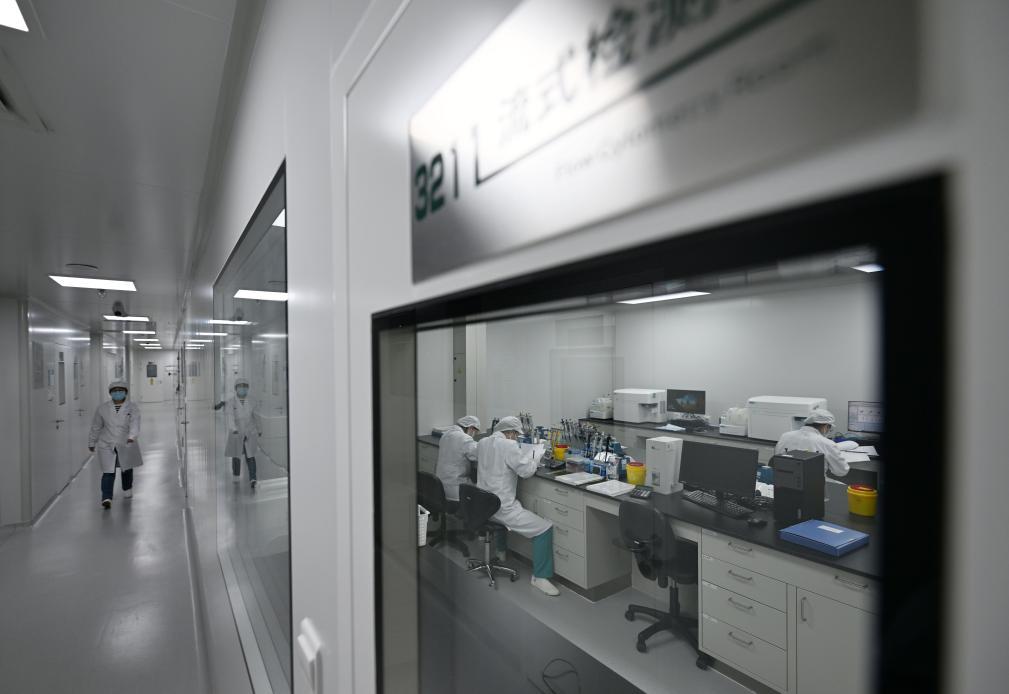 3月21日,合源生物科技(天津)有限公司工作人員在生產(chǎn)基地的檢測室進行檢測。新華社記者 趙子碩 攝
