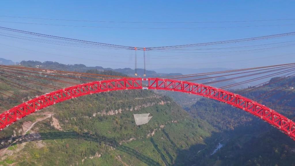 11月27日,由中鐵工業(yè)旗下中鐵九橋參建的世界最大跨度上承式鋼桁拱橋——武兩高速公路鳳來大溪河特大橋主拱合龍。