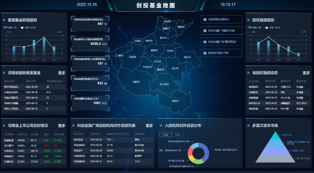 可視化呈現(xiàn)全國主流創(chuàng)投基金的分布情況、投資偏好與階段標(biāo)簽,支持按地域、賽道、投資階段進(jìn)行篩選,幫助科技企業(yè)精準(zhǔn)定位“對的資本”,并展示近五年河南省新增備案基金數(shù)量及規(guī)模、股權(quán)融資趨勢以及輿情監(jiān)控。