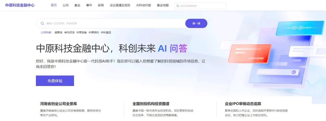 作為垂直領(lǐng)域的大模型平臺,“中原科技金融中心”聚焦科技企業(yè)成長全周期與金融服務(wù)全流程。該平臺集成企業(yè)庫、創(chuàng)投基金資源、行業(yè)研報、融資數(shù)據(jù)、會議服務(wù)等多維功能模塊,通過深度學(xué)習(xí)政策文件、企業(yè)數(shù)據(jù)與創(chuàng)投基金信息,構(gòu)建起懂科技、懂金融、懂政策的“超級顧問”能力,致力于為河南省乃至全國的科創(chuàng)企業(yè)提供從0到IPO全生命周期一站式服務(wù)。