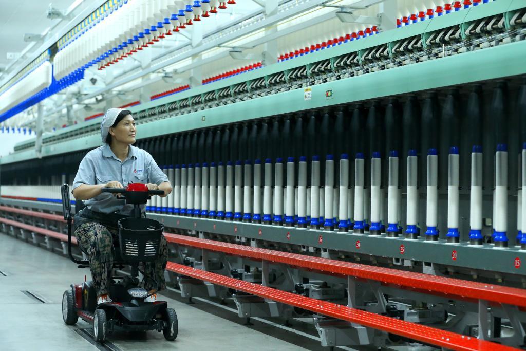 7月30日,山東省青島市一家科技紡織企業(yè)的工人在智慧紡紗生產線上巡檢。新華社發(fā)(梁孝鵬攝)