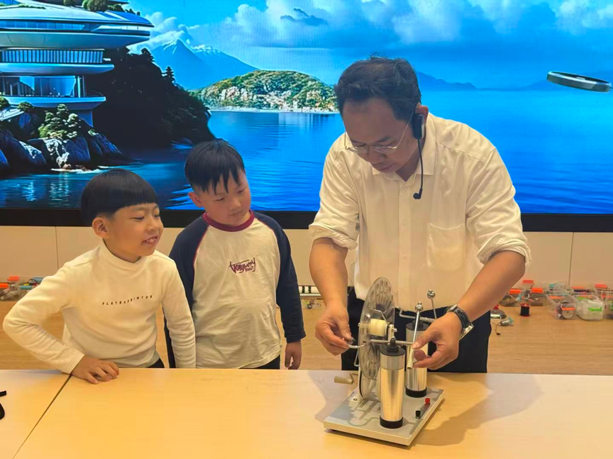 隨后,鋪滿地面的電磁儀、電動(dòng)機(jī)、燧石火種等30余件教具依次登場(chǎng)。三個(gè)多小時(shí)寓教于樂(lè),李亦明帶領(lǐng)同學(xué)們?cè)趯?shí)驗(yàn)中重新發(fā)現(xiàn)電磁感應(yīng)、電能轉(zhuǎn)化機(jī)械能等物理原理,探索人類從燃燒能源、轉(zhuǎn)化能源到存儲(chǔ)能源、利用零碳能源的科學(xué)發(fā)展史。