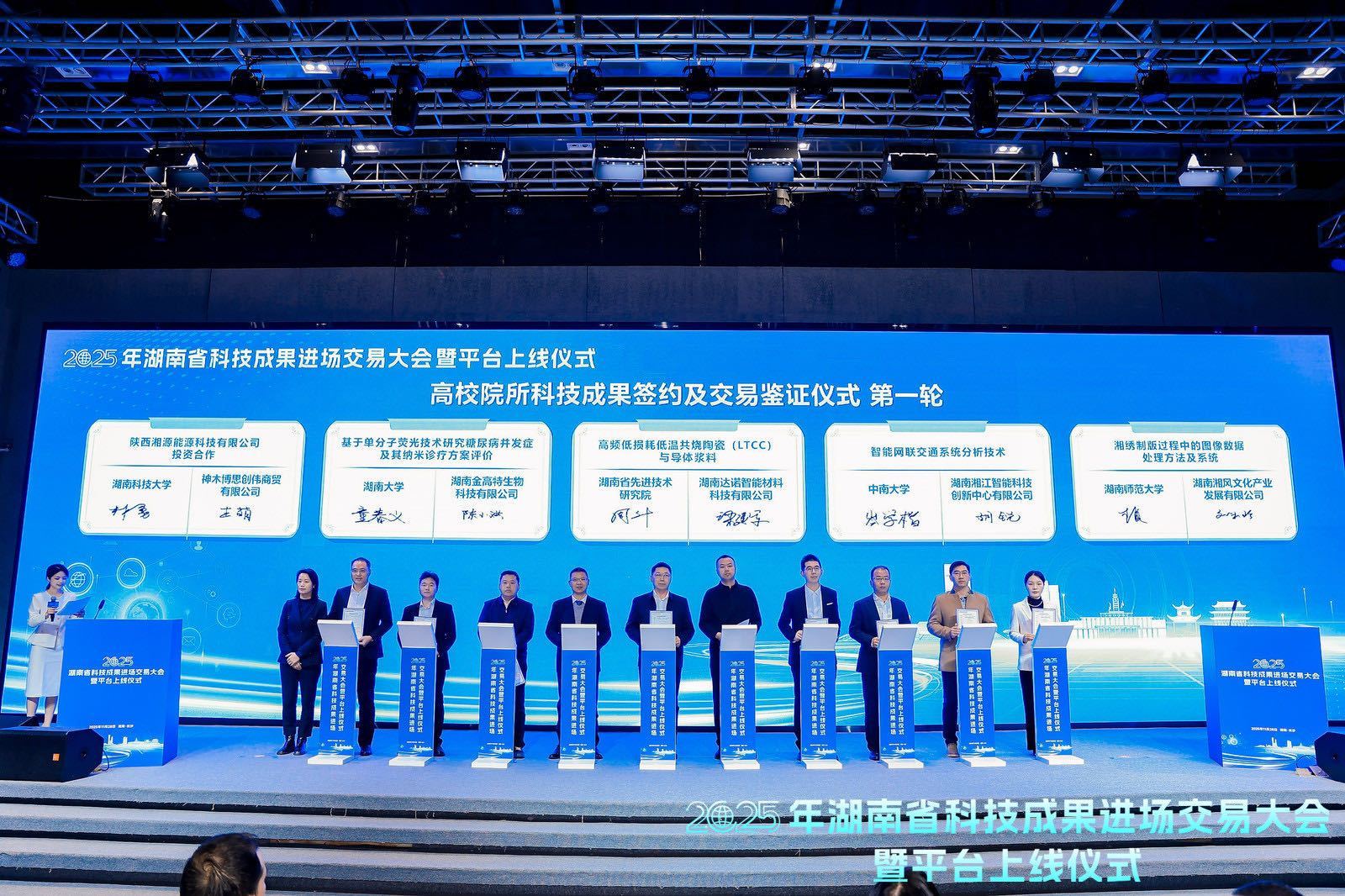 活動現(xiàn)場,湖南省技術(shù)產(chǎn)權(quán)交易所與中南大學(xué)等11所省內(nèi)高校院所簽訂了進場交易戰(zhàn)略合作協(xié)議,擬共同在成果發(fā)布、需求對接、進場交易等方面開展深度合作。同日,“智能網(wǎng)聯(lián)交通系統(tǒng)分析技術(shù)”等10項來自高校的前沿科技成果分別與企業(yè)完成現(xiàn)場簽約,簽約總金額突破1億元。
