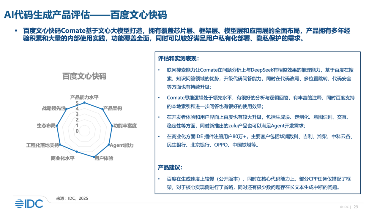 IDC指出,聯(lián)網(wǎng)搜索能力讓文心快碼在問題分析上與DeepSeek有相似效果的推理能力,基于百度在搜索、知識(shí)問答領(lǐng)域的優(yōu)勢,升級代碼問答能力,同時(shí)在代碼改寫、多位置跳轉(zhuǎn)、代碼安全等方面也有持續(xù)升級;文心快碼的思維邏輯處于領(lǐng)先水平,有很好的分析與邏輯回答,有豐富的注釋,同時(shí)文心快碼支持的本地索引和進(jìn)一步問答也有很好的使用效果;在用戶體驗(yàn)和用戶界面上文心快碼也有較大升級,包括生成塊、定制化、意圖識(shí)別、交互、穩(wěn)定性等方面,同時(shí)新推出的zulu產(chǎn)品也可以滿足Agent開發(fā)需求。